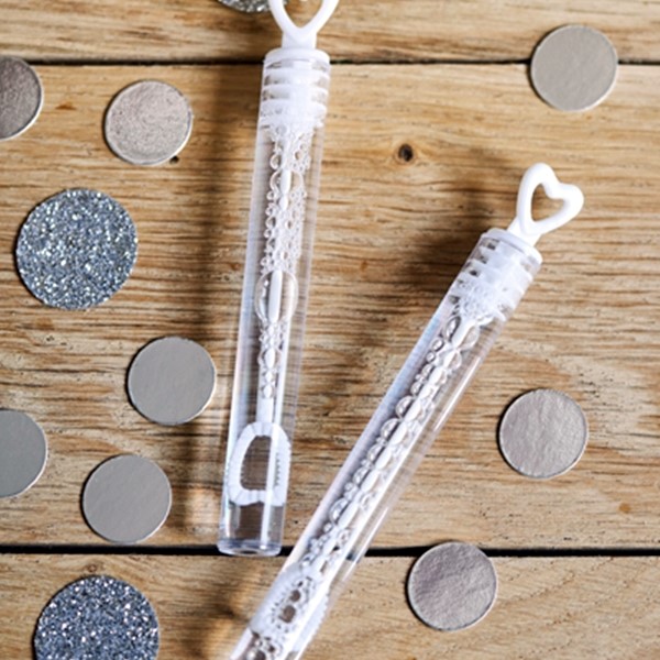 Bańki mydlane w białych fiolkach w kształcie serduszka przeznaczone są do zastosowań dekoracyjnych podczas uroczystości. Produkt zawiera płyn, co umożliwia natychmiastowe użycie. Forma opakowania zapewnia spójny efekt wizualny w aranżacjach okolicznościowych.