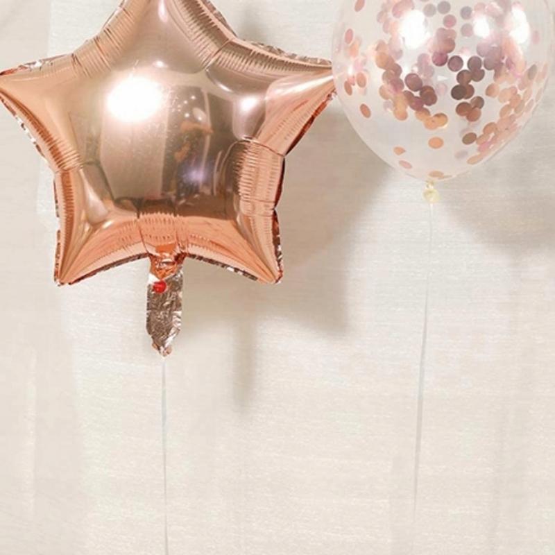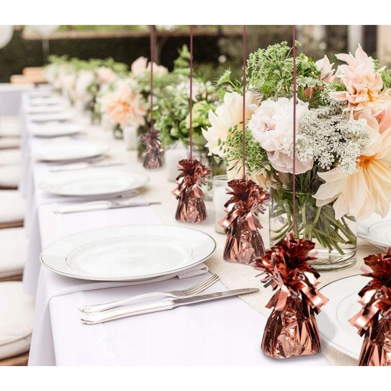 Ciężarek pozwala na mocowanie balonów wypełnionych helem i wykorzystanie ich w dekoracjach okolicznościowych. Błyszcząca folia oraz kolor różowego złota podkreślają charakter uroczystości i wzbogacają oprawę wizualną wydarzenia.