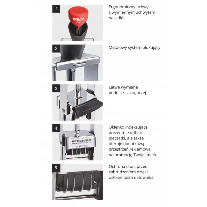 - Osłona taśm datownika chroni dłoń przed zabrudzeniem tuszem podczas przestawiania daty;