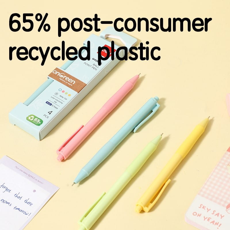 Długopis kulkowy z końcówką mini tip 0,7 mm, zapewniający precyzyjne pisanie. Tusz o niskiej lepkości gwarantuje płynne, lekkie pisanie bez przerywania, a ergonomiczna konstrukcja zwiększa komfort użytkowania. Wykonany w 65% z plastiku pochodzącego z recyklingu pokonsumenckiego, w opakowaniu bez tworzyw sztucznych. Zestaw zawiera 4 sztuki długopisów z niebieskim wkładem, w mixie kolorów (kolor wysyłany losowo).