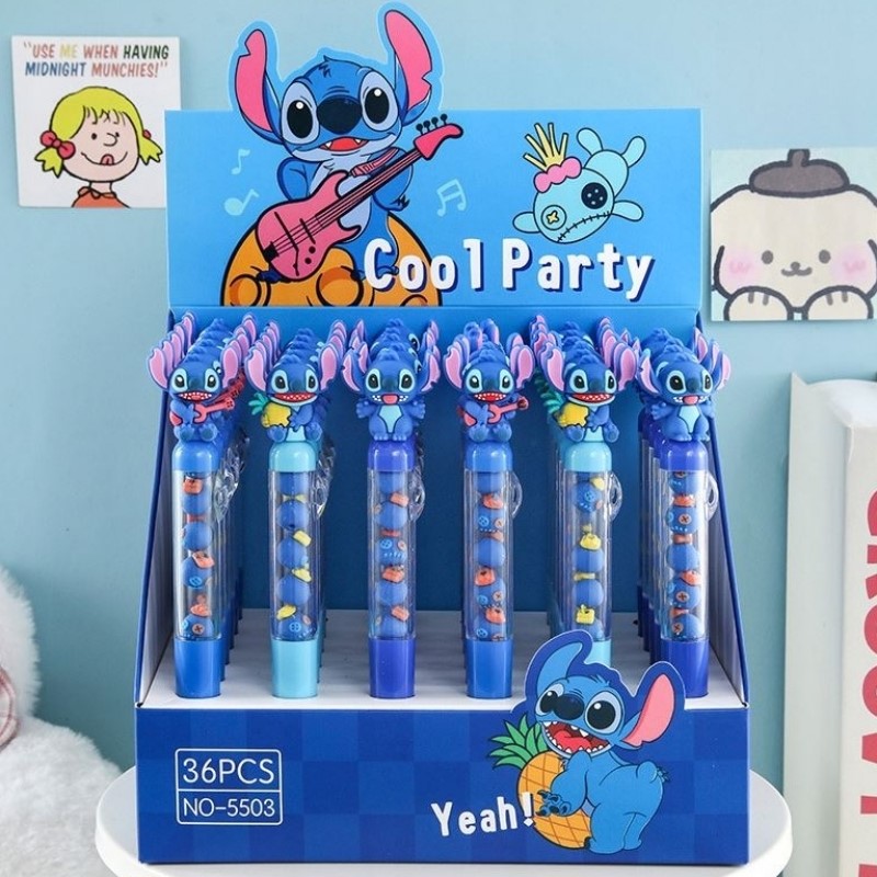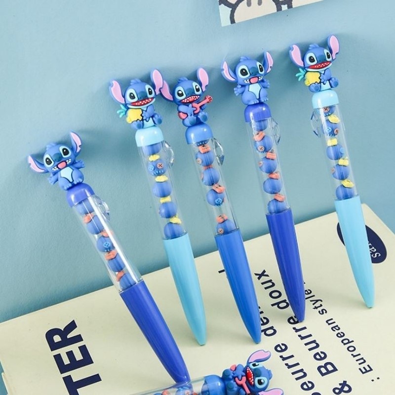 Produkt wykonany z tworzywa sztucznego z wykończeniem w kształcie Stitcha. Długopis posiada przezroczystą komorę z kulkami dekoracyjnymi, które można wykorzystać do stworzenia bransoletki. Wyposażony w wymienny wkład startowy w kolorze czarnym.