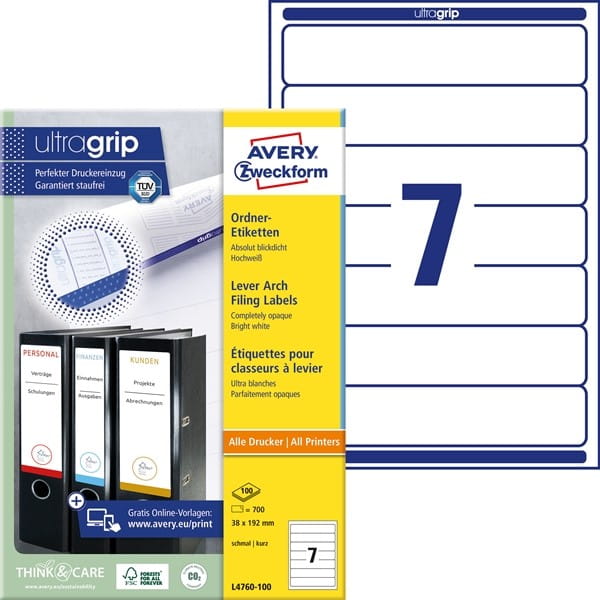Etykiety papierowe do segregatora 192x38mm AVERY ZWECKFORM ultragrip 100ark 700etykiet białe /l4760-100 /