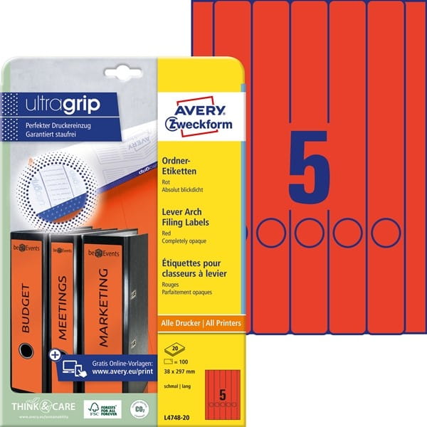 Etykiety papierowe do segregatora 38x297mm AVERY ZWECKFORM ultragrip 20ark 100etykiet czerwone /l4748-20 /