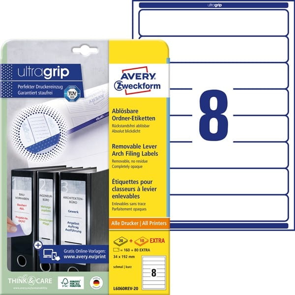 Etykiety papierowe usuwalne do segregatora 34x192mm AVERY ZWECKFORM ultragrip 20+10ark 240etykiet białe /l6060rev-20 /