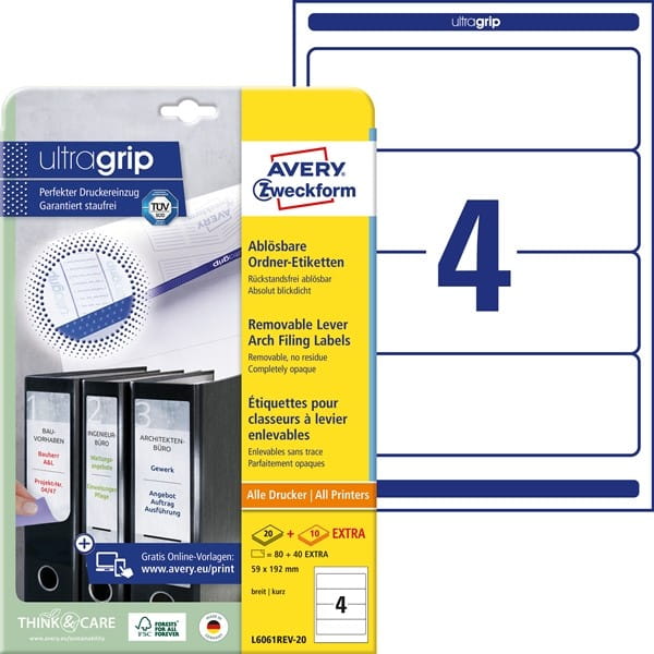 Etykiety papierowe usuwalne do segregatora 59x192mm AVERY ZWECKFORM ultragrip 20+10ark 120etykiet białe /l6061rev-20 /