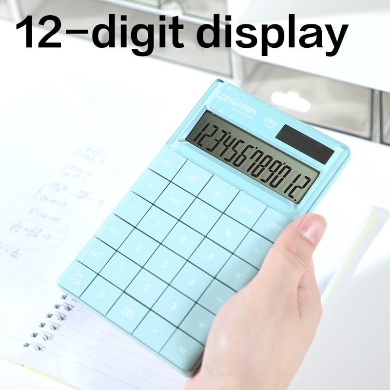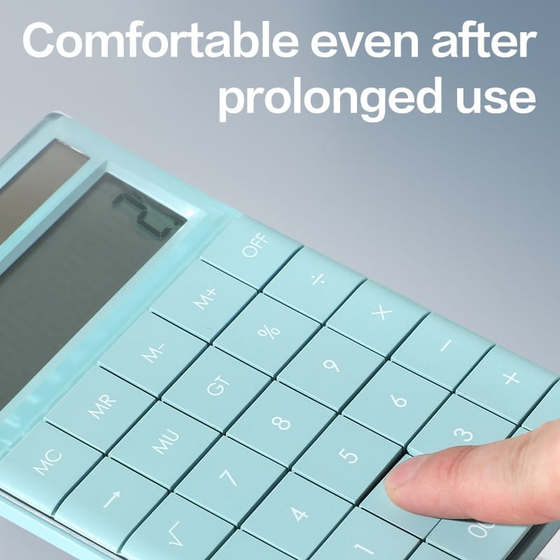 Kalkulator z 12-cyfrowym wyświetlaczem umożliwia wykonywanie precyzyjnych obliczeń także dla dużych wartości. Akrylowy ekran zapewnia elegancki wygląd i odporność na zarysowania. Podwójne zasilanie (bateria oraz energia słoneczna) zwiększa wygodę użytkowania, a funkcja auto/manual OFF pomaga oszczędzać energię i wspiera dłuższą żywotność urządzenia.