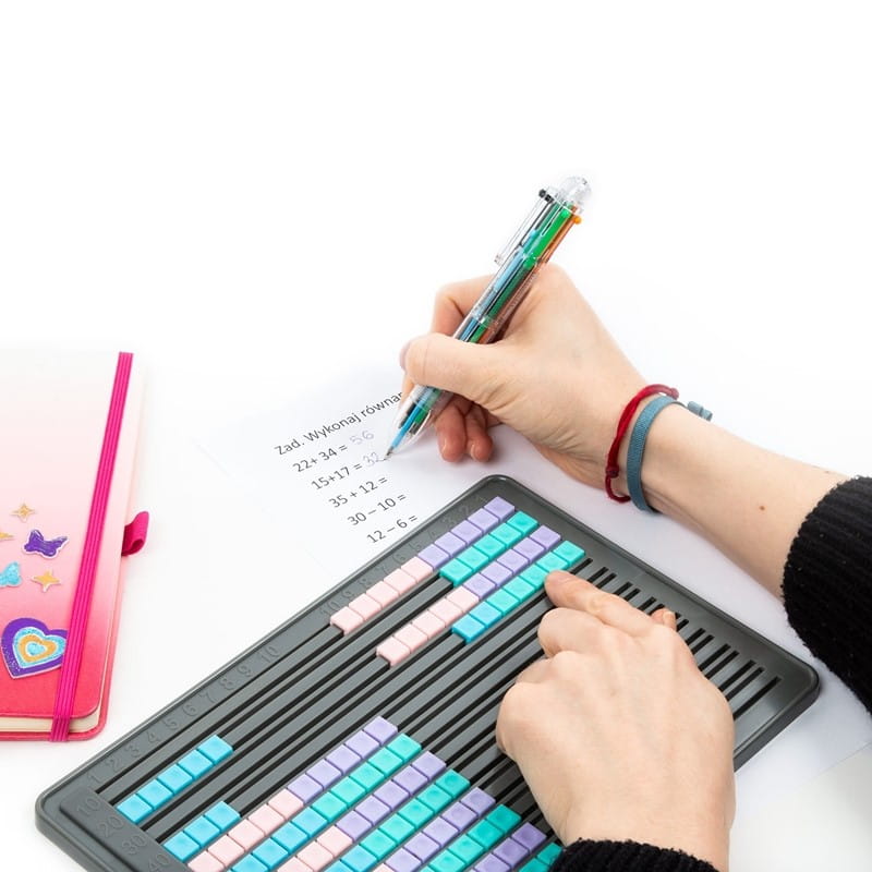 - Pastelowe koraliki w kolorach zielonym, niebieskim, fioletowym oraz różowym pomogą w nauce dodawania, odejmowania i mnożenia.