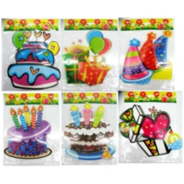 - Komplet naklejek dekoracyjnych składających się z 6 wzorów z motywem urodzinowym, każdy na arkuszu o wymiarach 15x19cm