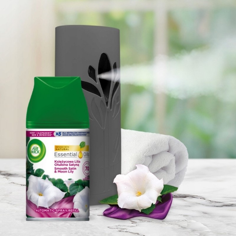 Air Wick Freshmatic to wygodne rozwiązanie, które umożliwia dozowanie świeżego zapachu w równych odstępach czasu. Wystarczy włożyć wkład zapachowy i baterie, a urządzenie automatycznie wypełni przestrzeń subtelnym aromatem. Dzięki szerokiej gamie zapachów każdy może znaleźć wariant idealny dla siebie. Zestaw dostarczany jest z losowo wybranym zapachem, jednak istnieje możliwość wskazania preferencji w uwagach do zamówienia.