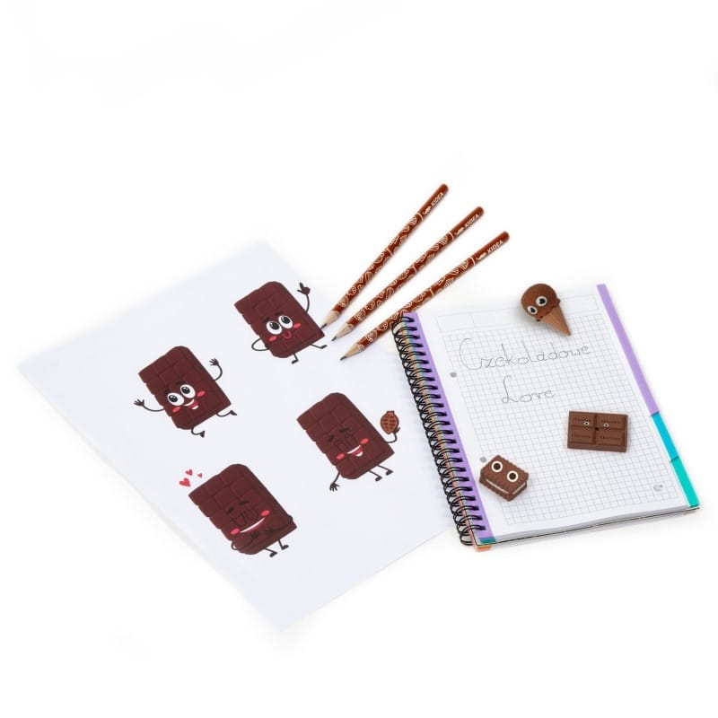 • Zapachowy niezbędnik Kidea o słodkim, czekoladowym aromacie, który zawiera 3 ołówki o twardości rysika HB oraz trzy smakowite gumki w kształcie babeczki, czekolady i ciasteczka.