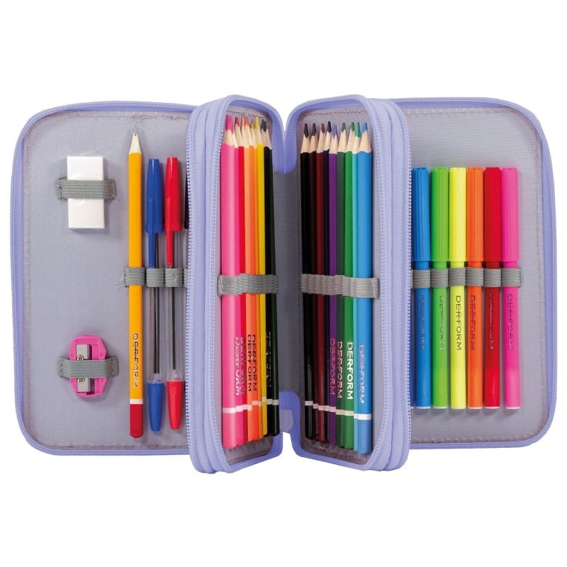- Trzykomorowy piórnik BackUP z wyposażeniem posiada:
