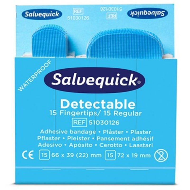 - Plastry niebieskie wykrywalne na opuszki palców Salvequick Cederroth REF 51030126 to wysokiej jakości elastyczne i samoprzylepne plastry na opuszki palców, zapakowane w blister zawierający 30 sztuk w dwóch rozmiarach, który jest dopasowany do specjalnych Automatów Salvequick REF 490700