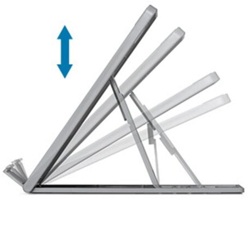 • Przemyślana konstrukcja 2 w 1 zapewnia regulację wysokości i kąta nachylenia, co sprzyja przyjmowaniu prawidłowej postawy, jest korzystne dla naszych oczu, przynosi komfort dla szyi i ramion, a jednocześnie pozwala utrzymywać odpowiednie chłodzenie wewnętrznych elementów laptopa.