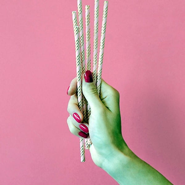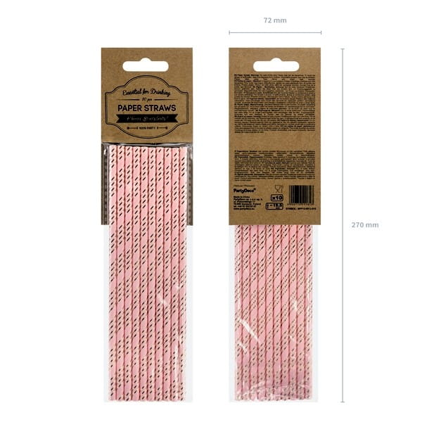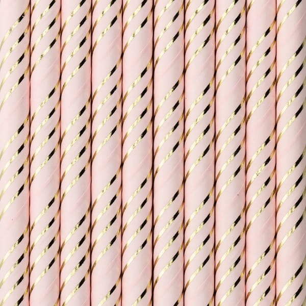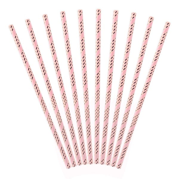 • Słomki papierowe w kolorze jasnoróżowym ze złotymi metalizowanymi ukośnymi paskami to doskonały dodatek do różnego rodzaju imprez okolicznościowych