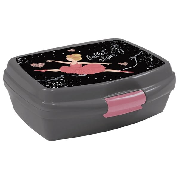 • Pojemnik kanapkowy w kolorze szarym z motywem baletnicy zamykany na jeden wygodny zatrzask