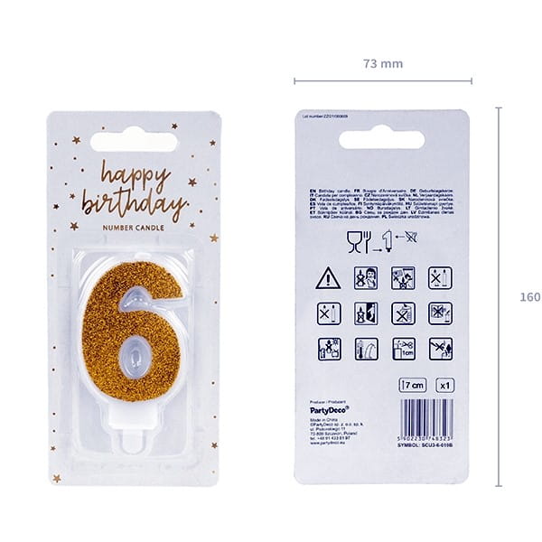 Świeczka urodzinowa 7cm PARTYDECO CYFRA "6" brokatowa złota 1szt.