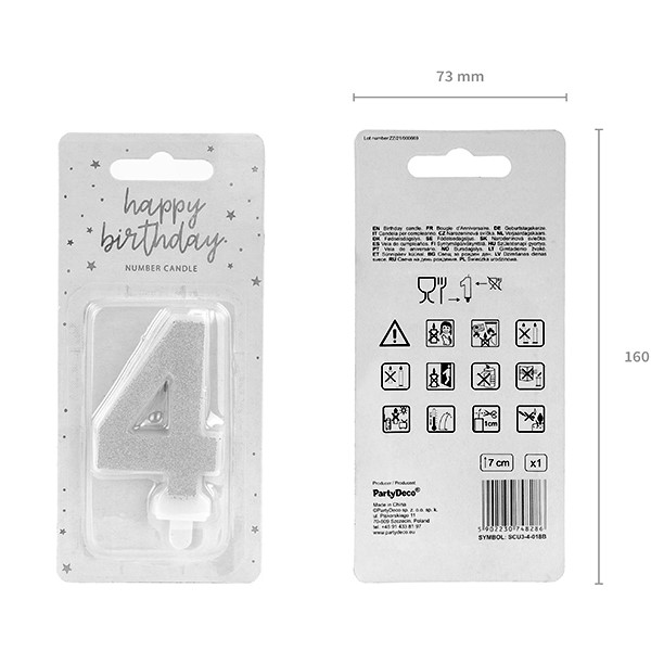 Świeczka urodzinowa w kształcie cyfry 4 w kolorze srebrnym z brokatowym wykończeniem przeznaczona jest do dekoracji tortów. Produkt wyposażony jest w podstawkę umożliwiającą stabilne umieszczenie w cieście. Konstrukcja zapewnia wygodne użytkowanie podczas przygotowania dekoracji.