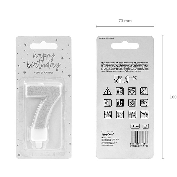 Świeczka urodzinowa w kształcie cyfry 7 w kolorze srebrnym z brokatowym wykończeniem przeznaczona jest do dekoracji tortów. Produkt umożliwia łatwe umieszczenie w cieście dzięki konstrukcji do wbicia. Uniwersalna forma pozwala na zastosowanie podczas różnych uroczystości.