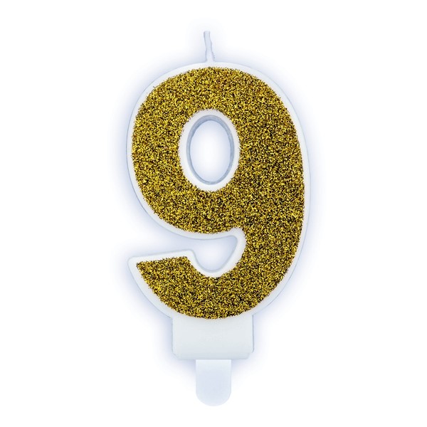 Świeczka urodzinowa w kształcie cyfry 9 przeznaczona do dekoracji tortów okolicznościowych. Brokatowe wykończenie w kolorze złotym zapewnia estetyczne uzupełnienie kompozycji.
