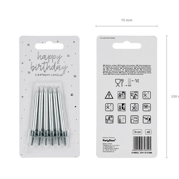 Świeczki urodzinowe z podstawką 6cm PARTYDECO gładkie metalizowane srebrne 6szt. /SCP-10-018ME/