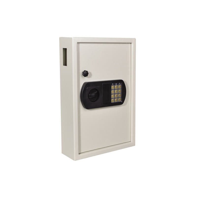 Metalowa szafka na klucze wyposażona w ryglowany zamek szyfrowy.