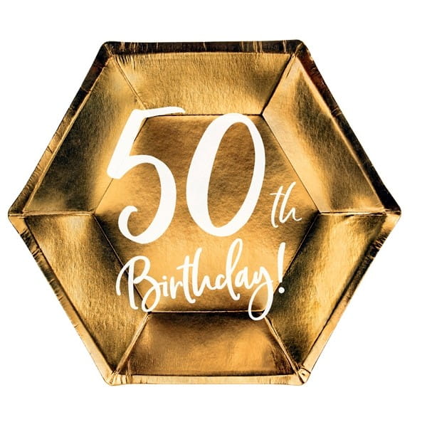 Talerze papierowe 20x17cm PARTYDECO z białym nadrukiem 50TH BIRTHDAY! metalizowane złote 6szt. /TPP73-50-019M/