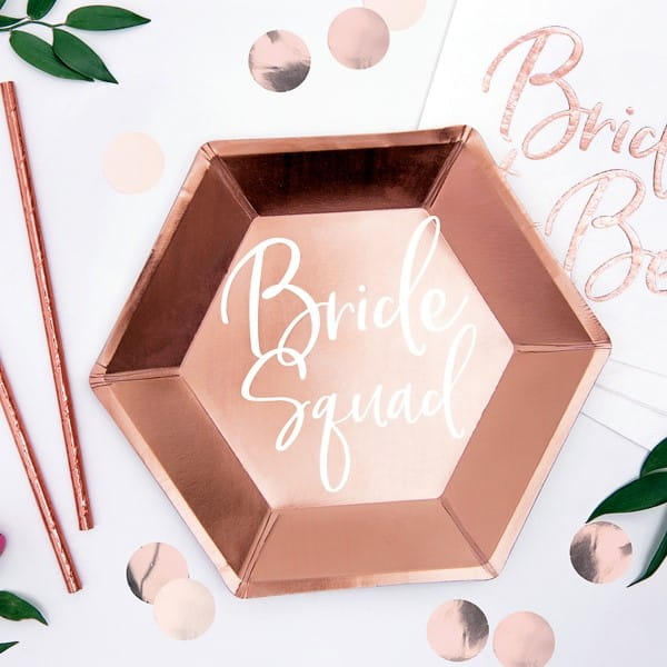 Talerze papierowe 23cm PARTYDECO w kształcie sześciokąta z nadrukiem BRIDE SGUAD różowe złoto 6szt. /TPP21-019R/