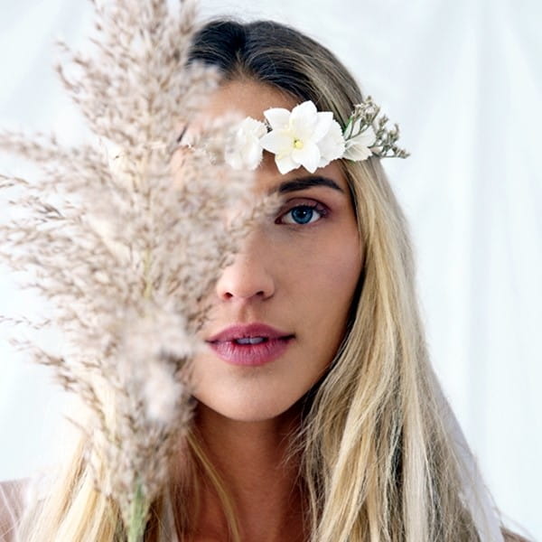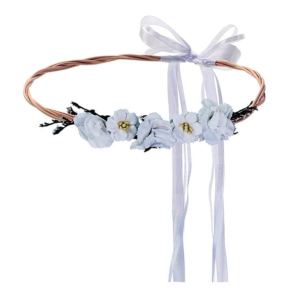 • Niezwykle elegancki i delikatny wianek wykonany z ratanu w kolorze naturalnym, zdobiony kwiatkami w kolorze białym