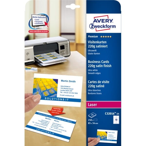 Wizytówki QuickClean; 85 x 54 mm, 250 szt., 220 g, satynowane, śnieżnobiałe, Avery Zweckform /C32016-25/