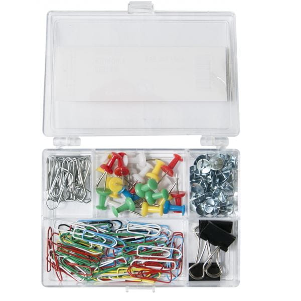 - w skład zestawu wchodzi pinezka tablicowa (20 szt.), spinacz metalowy 26 mm (25 szt.), spinacz kolorowy 26 mm (70 szt.), pinezka metalowa (35 szt.), clip 19 mm (3 szt.)