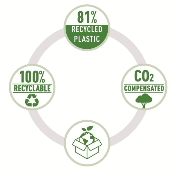 • Wykonany z plastiku w 81% pochodzącego z recyklingu po konsumenckiego, neutralny dla klimatu dzięki redukcji emisji CO2 i systemowi kompensacji
